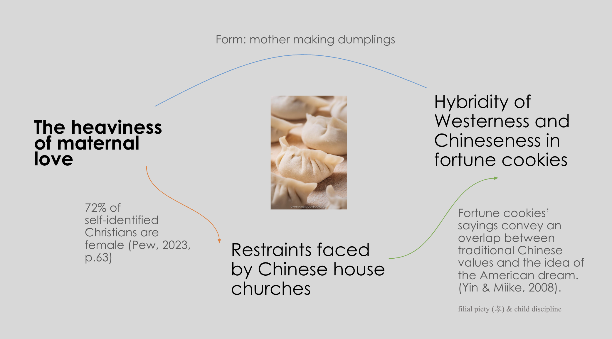 This experimental film explores the burden and complexity of maternal affection within Chinese Christian families, through the symbolic lens of fortune cookies. It draws a contrast between Christianity — introduced by Syrian missionaries and later used as a colonial tool by the British — and fortune cookies, a cultural invention carried to the U.S. by East Asian immigrants.