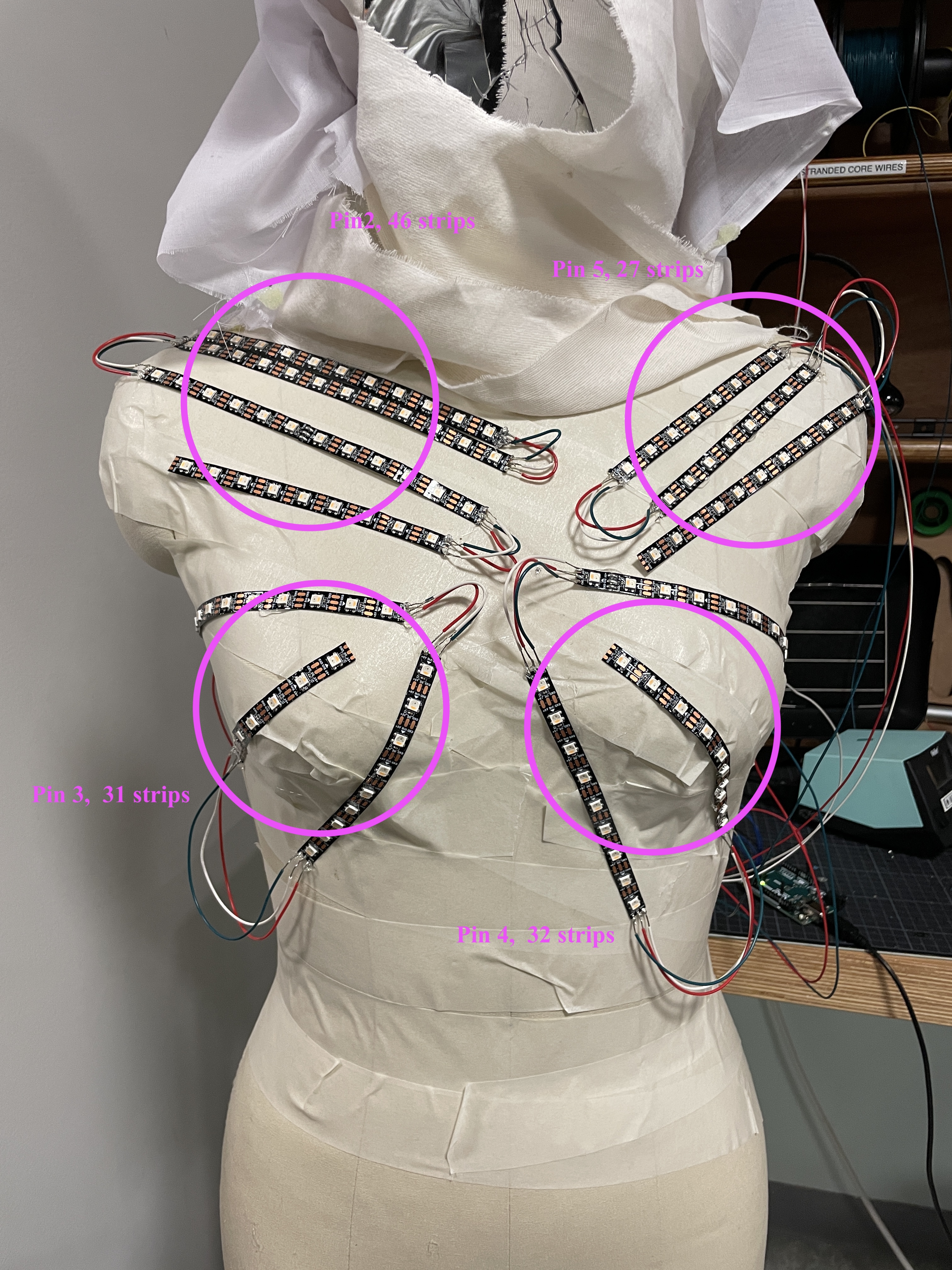 - Attaching to the Dummy: The dummy’s soft fabric surface posed challenges in attaching the NeoPixels. Taping the dummy first created a sturdier surface for application.
